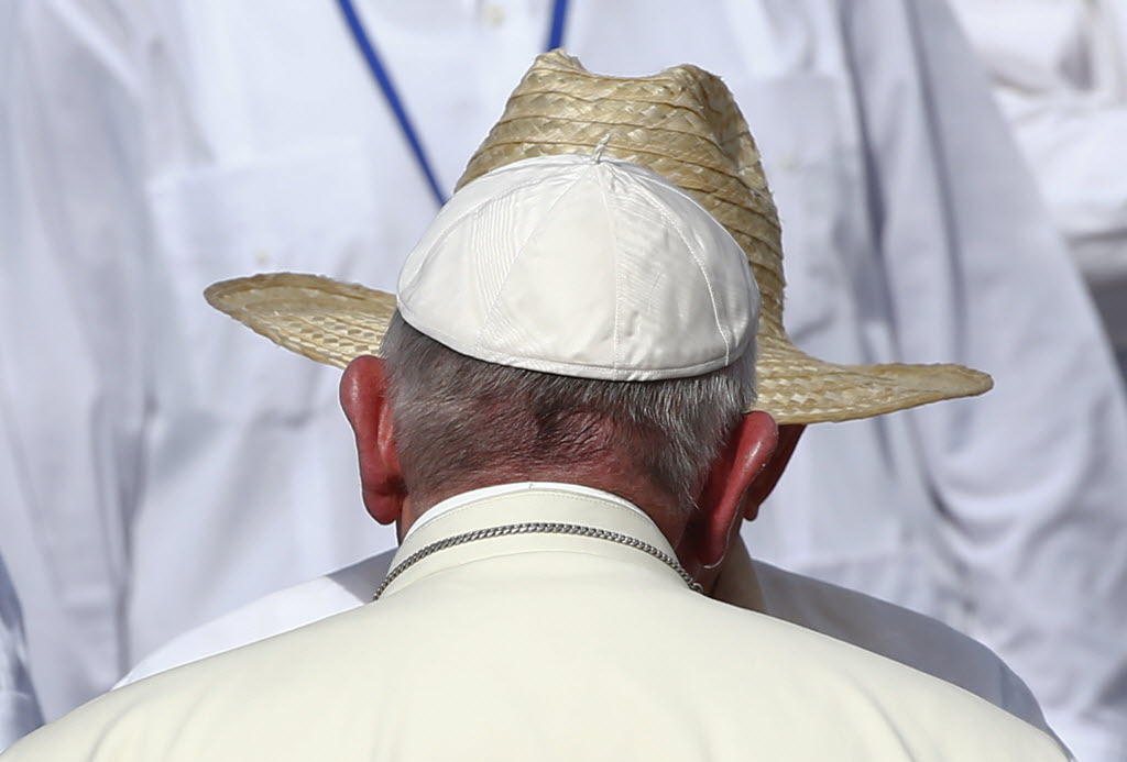 Pope Francis is greeted by Cuba’s President Raul Castro as he arrives to celebrate Mass in the Plaza of the Revolution, in Holguin, Cuba, Monday. Francis traveled to Cuba’s fourth-largest city, Holguin, and celebrated a Mass where Cuban rhythms mixed with church hymns under a scorching tropical sun. (Tony Gentile/Pool via AP)