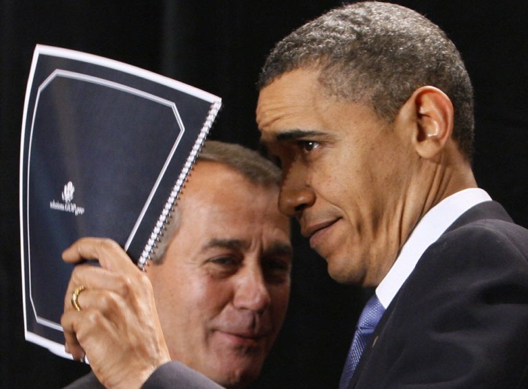In this Jan. 29, 2010, file photo President Barack Obama holds up a document of Republican solutions given to him by then-House Minority Leader John Boehner of Ohio before speaking to Republican lawmakers at the GOP House Issues Conference in Baltimore. Boehner’s announced exit as House speaker and from Congress altogether caps a political career that began as the head of a homeowners association in an Ohio neighborhood and made him second in line to the presidency. (AP Photo/Charles Dharapak, File)