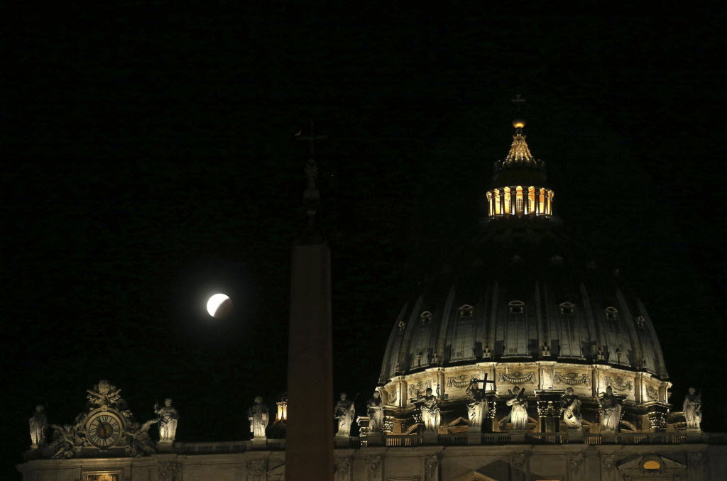 Earth’s shadow obscures part of a so-called Supermoon during a total lunar eclipse above St. Peter’s Basilica, at the Vatican, Monday. Supermoon, or perigee moon, is the name given when the full or new moon comes closest to the Earth making it appear bigger. (Alessandro Di Meo/ANSA via AP)