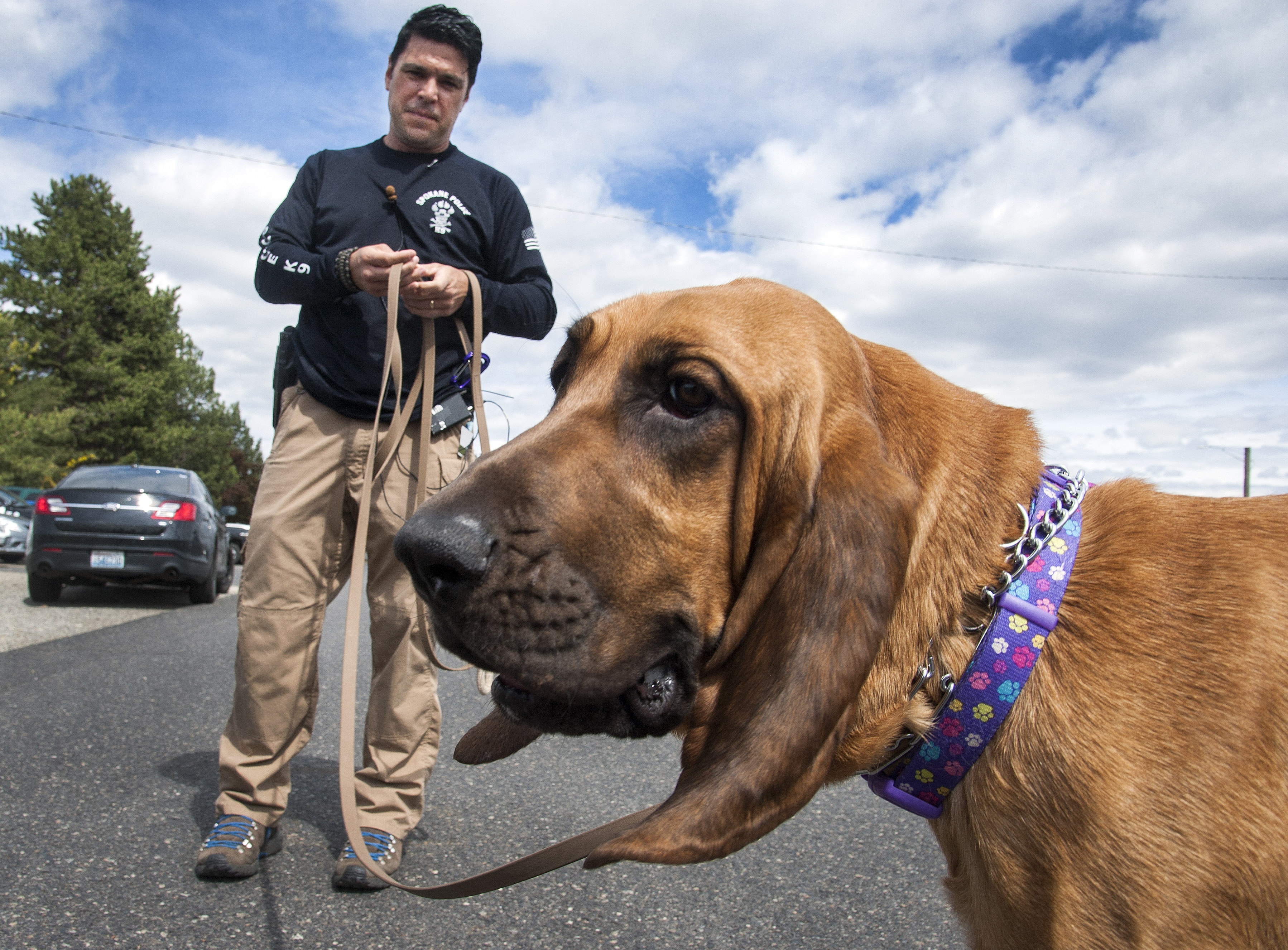 S-R photojournalist Dan Pelle covered the Spokane Police Department’s press conference where they unveiled the new member to their team. Daisy the 14-month-old bloodhound is ready for her close-up shot, April 28, 2016, at the Spokane Police Academy. She is the the department’s first bloodhound and will be tracking down missing children and vulnerable adults. Sgt. Jason Reynolds is her handler.