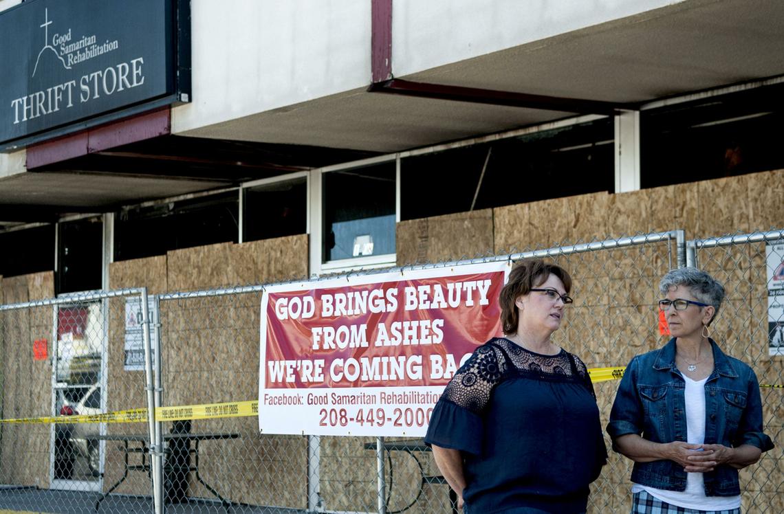 Good Samaritan Rehabilitation Thrift Store manager Nancy Cafferty, left, and floor manager Susan Harding talk about rebuilding the Coeur d’Alene store that burned in a recent fire. The Good Samaritan Rehabilitation Thrift Store in Coeur d’Alene was gutted by fire earlier this month, but store employees are unbowed and unbroken, vowing to get up and running as soon as possible. Subscription story by Nina Culver here. (Kathy Plonka / The Spokesman-Review)