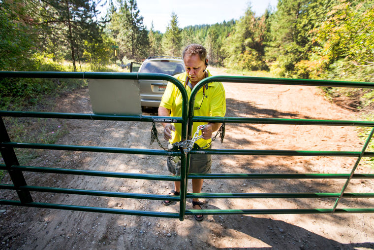 Chris Walsh, owner of Revolutionary Realty, locks up an entrance gate on Friday to a property in Athol that is ideal for a prepper, or survivalist. (Jake Parrish/Coeur d’Alene Press)