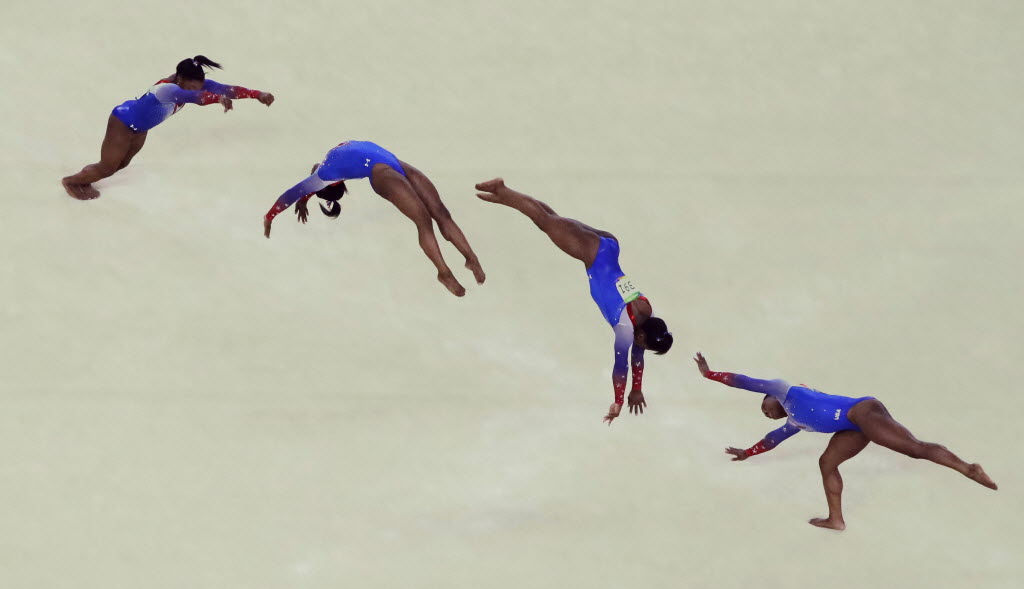In this multiple exposure photo, United States’ Simone Biles performs on the floor during the artistic gymnastics women’s apparatus final at the 2016 Summer Olympics in Rio de Janeiro, Brazil, Tuesday. (AP Photo/Julio Cortez)