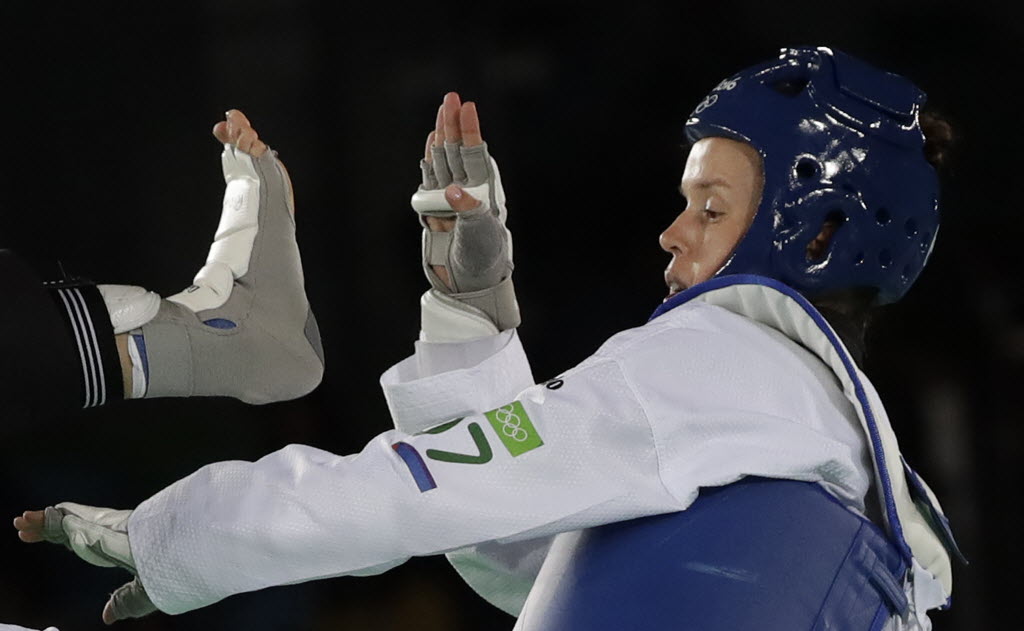 Ana Zaninovic of Croatia competes with Kimia Alizadeh Zenoorin of Iran in a women’s Taekwondo 57-kg event at the 2016 Summer Olympics in Rio de Janeiro, Brazil, Thursday. You write the cutline. (AP Photo/Andrew Medichini)