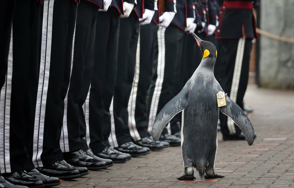 Uniformed soldiers of the King of Norway’s Guard parade for inspection by their mascot, king penguin Nils Olav, at Edinburgh Zoo, Monday. It was announced that the penguin who had previously been knighted has been promoted and given the new title of “Brigadier Sir Nils Olav”. (Jane Barlow/PA via AP)