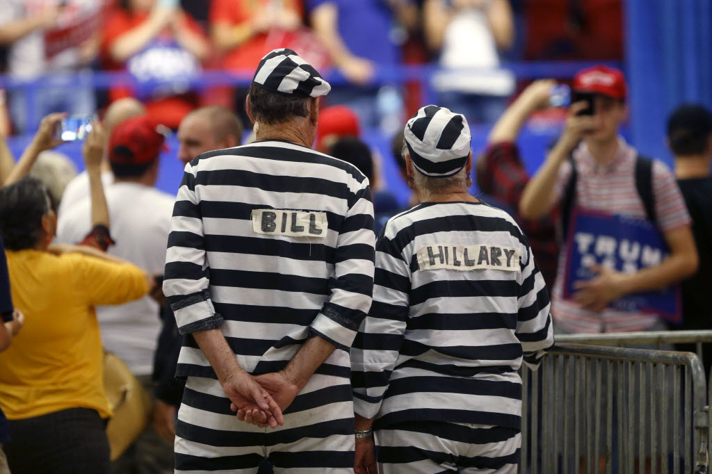 Supporters of Republican presidential candidate Donald Trump, dressed in outfits with the names Bill and Hillary on them, wait for Trump to speak at a campaign rally in Austin, Texas, Tuesday. You write the cutline. (AP Photo/Gerald Herbert)