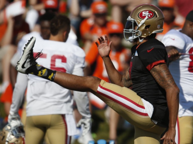 In an AP file photo from earlier this fall, San Francisco 49ers quarterback Colin Kaepernick kicks his leg as he warms up before facing the Denver Broncos during drills at the teams’ joint NFL football training camp Wednesday in Englewood, Colo. Kaepernick now is embroiled in a controversy re: his decision to sit during the national anthem to protest the treatment of African-Americans in this country. You write the cutline. (AP Photo/David Zalubowski)