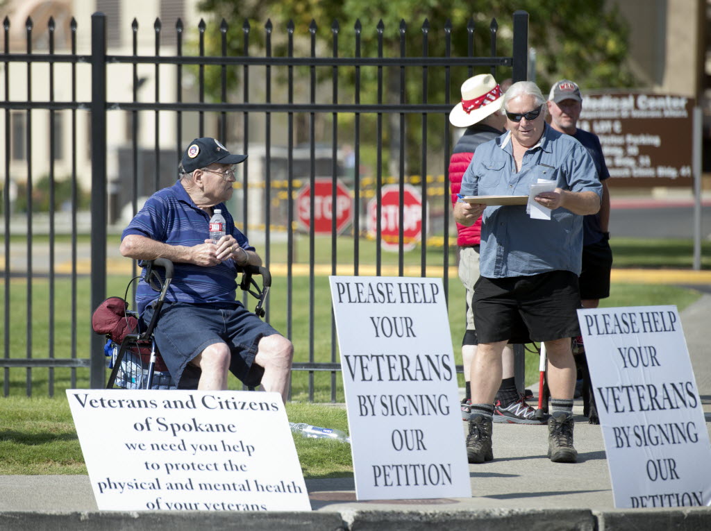 Air Force veteran Pat Fickle, 82, , left, sits outside the Spokane Veterans Administration Medical Center with Vietnam veteran Charles Bourg, who is holding a clipboard for petition signatures Monday. The veterans gathered to protest the closing of an exercise program that served veterans who needed fitness or therapy workouts. The veterans, ranging World War II to the recent Gulf Wars, say the program and the camaraderie of the people involved have helped them lose weight, combat diabetes and back problems. Fickle said the three-times-a-week workouts helped him cut down his insulin use and need for constant oxygen. Fickle served in the Air Force in the 1950s. SR story here, subscription. (Jesse Tinsley/SR photo)