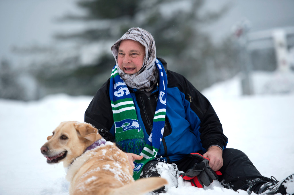 “She’s the happiest girl in the world,” said Roger Duval as he played with his Bella, his yellow Labrador at Patricia Simonet Laughing Dog Park in State Line on Monday. (Kathy Plonka/SR photo)