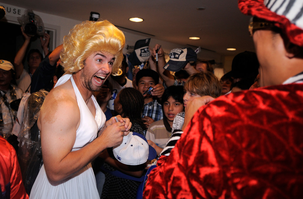 In this Sept. 25, 2008, file photo, Los Angeles Dodgers’ Blake DeWitt, left, laughs at Hiroki Kuroda as they sign autographs while wearing costumes as part of rookie hazing, after their Major League Baseball game against the San Diego Padres, in Los Angeles. That baseball hazing ritual of dressing up rookies as Wonder Woman, Hooters Girls and Dallas Cowboys cheerleaders is now banned. Major League Baseball created an Anti-Hazing and Anti-Bullying Policy that covers the practice. As part of the sport’s new labor deal, set to be ratified by both sides today, the players’ union agreed not to contest it. (AP Photo/Mark J. Terrill, File)