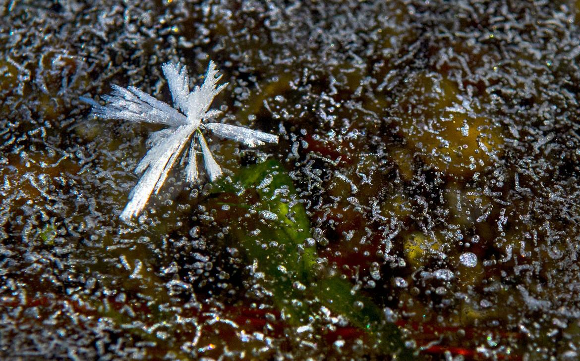 A bit of hoar frost formed on a thin layer of ice on Fernan Lake in Coeur d’Alene, Idaho on Thursday, Dec.8, 2016. (Kathy Plonka / The Spokesman-Review)