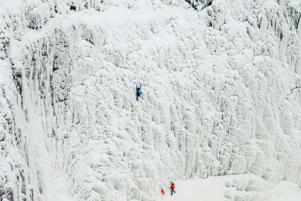 Spokane photographer Rika Ream traveled to Palouse Falls State Park during last weekend’s bitter cold weather to marvel at the ice around the 185-foot waterfall. The scene was spectacular. Daring ice climbers dropped her jaw even farther. She captured this photo of Jess Roskelley of Spokane leading a climb in the fragile ice in the mist of the main waterfall with Scott Coldiron, who’s belaying from below. “We were both wearing (kayaker’s) dry suits because of the spray,” Roskelley said. Rich Landers/SR Outdoors post here. (Rika Ream photo)