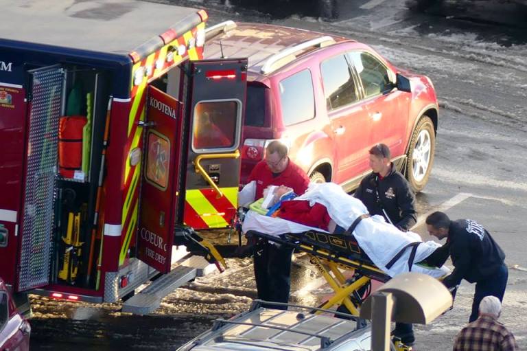 - 2:49 p.m. Injury Fall — 76YO female slipped on ice in lot @ 101 Sherman Ave/CdA & hit head, bleeding controlled.