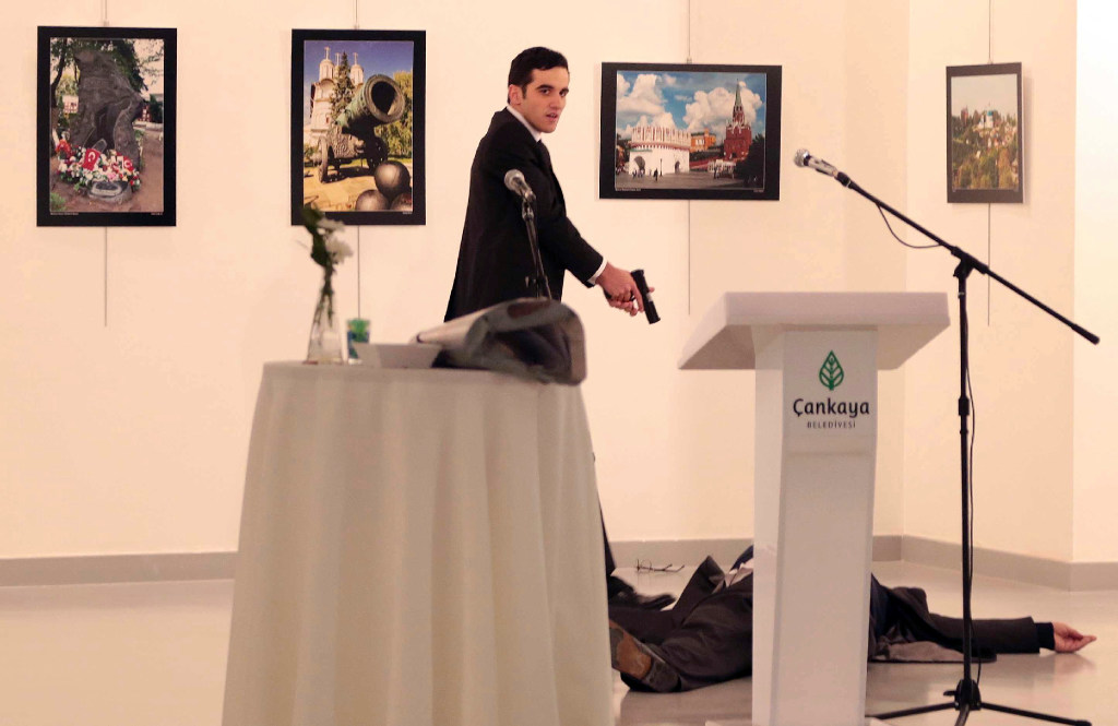 A Turkish policeman fatally shot Russia’s ambassador to Turkey on Monday in front of a shocked gathering at a photo exhibit and then, pacing near the body of his victim, appeared to condemn Russia’s military role in Syria, shouting: “Don’t forget Aleppo! Don’t forget Syria!” The leaders of Turkey and Russia said the attack in Ankara, the Turkish capital, was an attempt to disrupt efforts to repair ties between their countries, which have backed opposing sides in the Syrian civil war/ Chicago Tribune . More here.