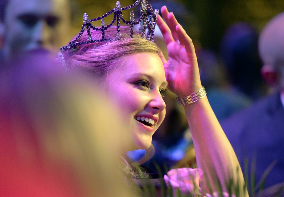 New 2016 Lilac Festival queen Megan Paternoster of Freeman High School gets used to balancing a tiara on her head while friends and family crowd around to congratulate her Sunday at the Bing Crosby Theater in Spokane. Paternoster was one of 14 candidates for the position, and another six became her “court.” Story by SReporter Scott Maben here. (Jesse Tinsley)