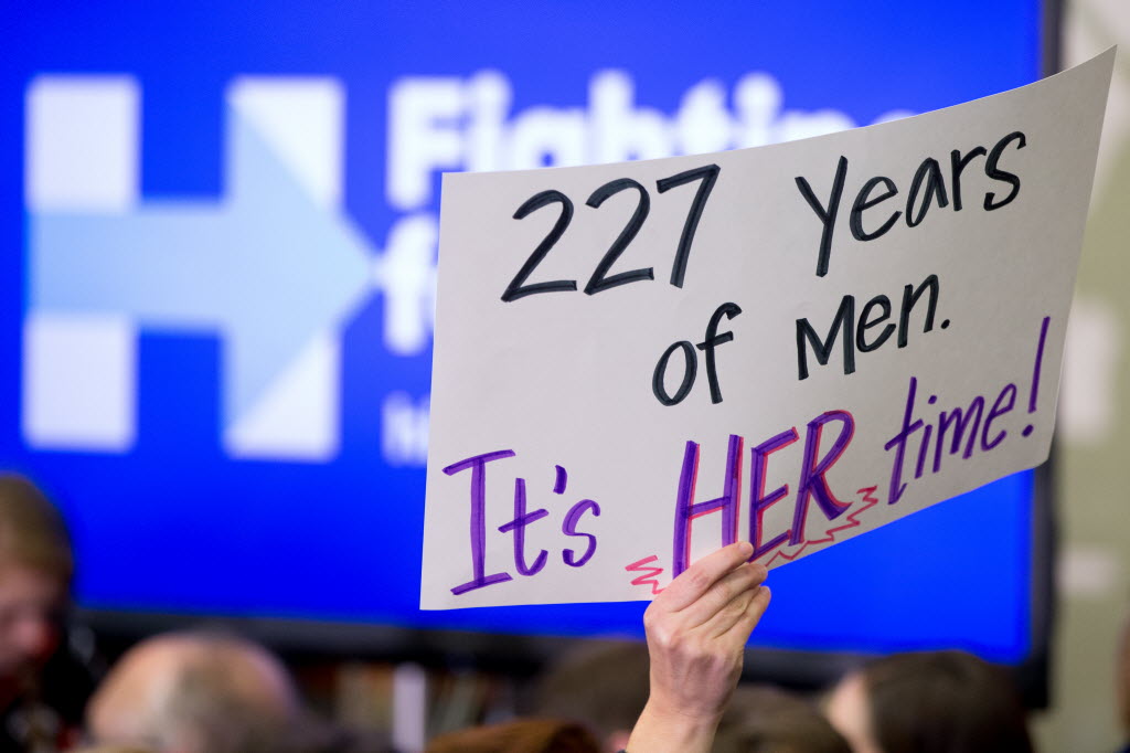 A member of the audience holds a campaign sign that reads “227 Years of Men. It’s HER Time!” during a rally for Democratic presidential candidate Hillary Clinton at Washington High School in Cedar Rapids, Iowa, Saturday. You write the cutline. (AP Photo/Andrew Harnik)