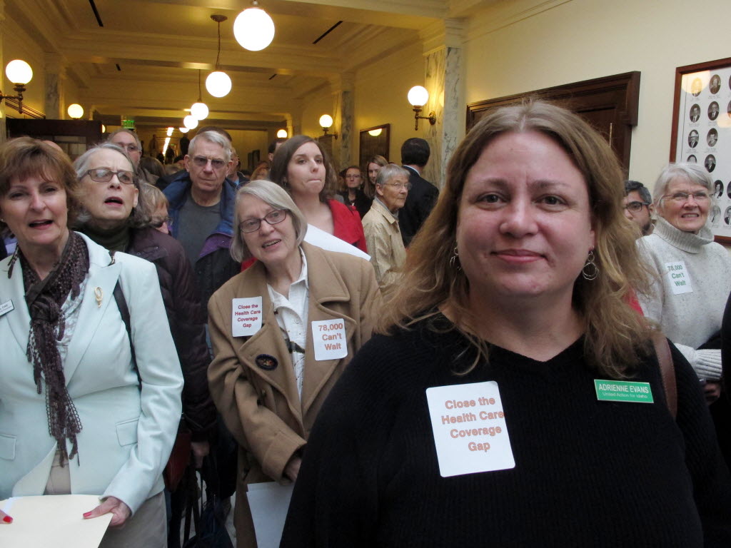 Adrienne Evans, right, along with hundreds of other Idahoans, line the halls of the state Capitol to testify the hearing of a Medicaid expansion bill in Boise on Tuesday. Tuesday marks the first time a legislative committee heard the measure. Only 12 people testified during the hour-long meeting that ended in no motion or vote. More here. (AP Photo/Kate Haake)