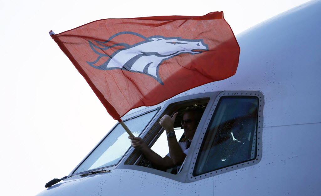Waving a Denver Broncos flag, the team’s airplane pilot leans out the window of the cockpit as players step off the plane after returning as victors over the Carolina Panthers in Super Bowl 50, Monday in Denver. (AP Photo/David Zalubowski)