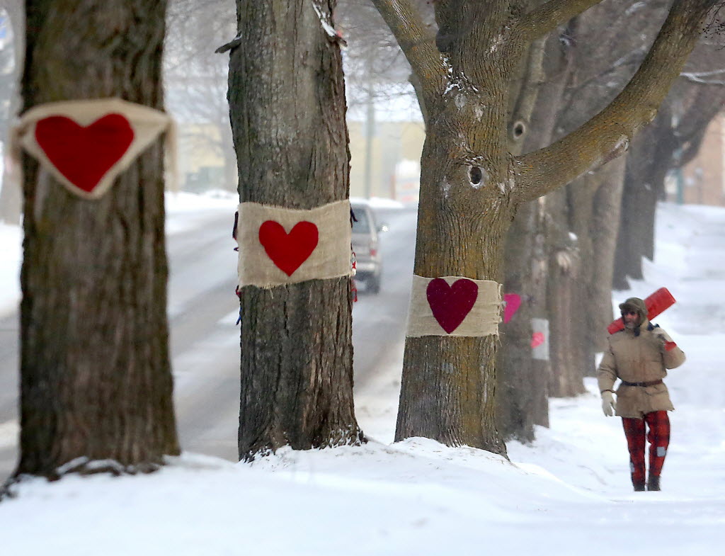 A man walks near trees along South Main Street in Lake Mills, Wis., adorned in symbols of affection, as residents in the area have affixed hearts to dozens of mature trees slated to be removed for a reconstruction and utility repair effort in 2018. The road, which doubles as State Highway 89, is a main thoroughfare into the city and is scheduled to be widened as part of the $5.2 million state and federally financed project. The decorations are meant as a visual tribute to the trees, many of which the city hopes to replace through a state Department of Transportation reimbursement fund. (John Hart /Wisconsin State Journal via AP)