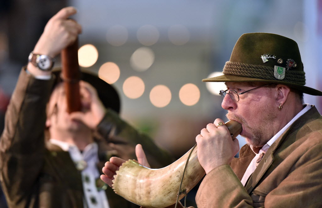 Competitors imitate the bellow sound of red deer during the German championships at the hunting fair in Dortmund, Germany, earlier today. The competition tries to find out, who can best mimic the mating call of a stag. You write the cutline. (AP Photo/Martin Meissner)