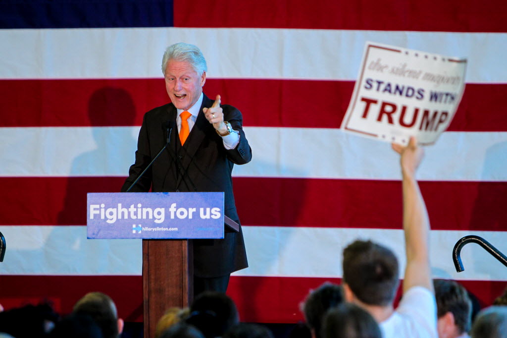 President Bill Clinton makes a point to a Donald Trump supporter, during a rally for Hillary Clinton. who is running for the Democratic presidential nomination, at the Port of Palm Beach in Riviera Beach, Fla., Monday. (Richard Graulich/The Palm Beach Post via AP)