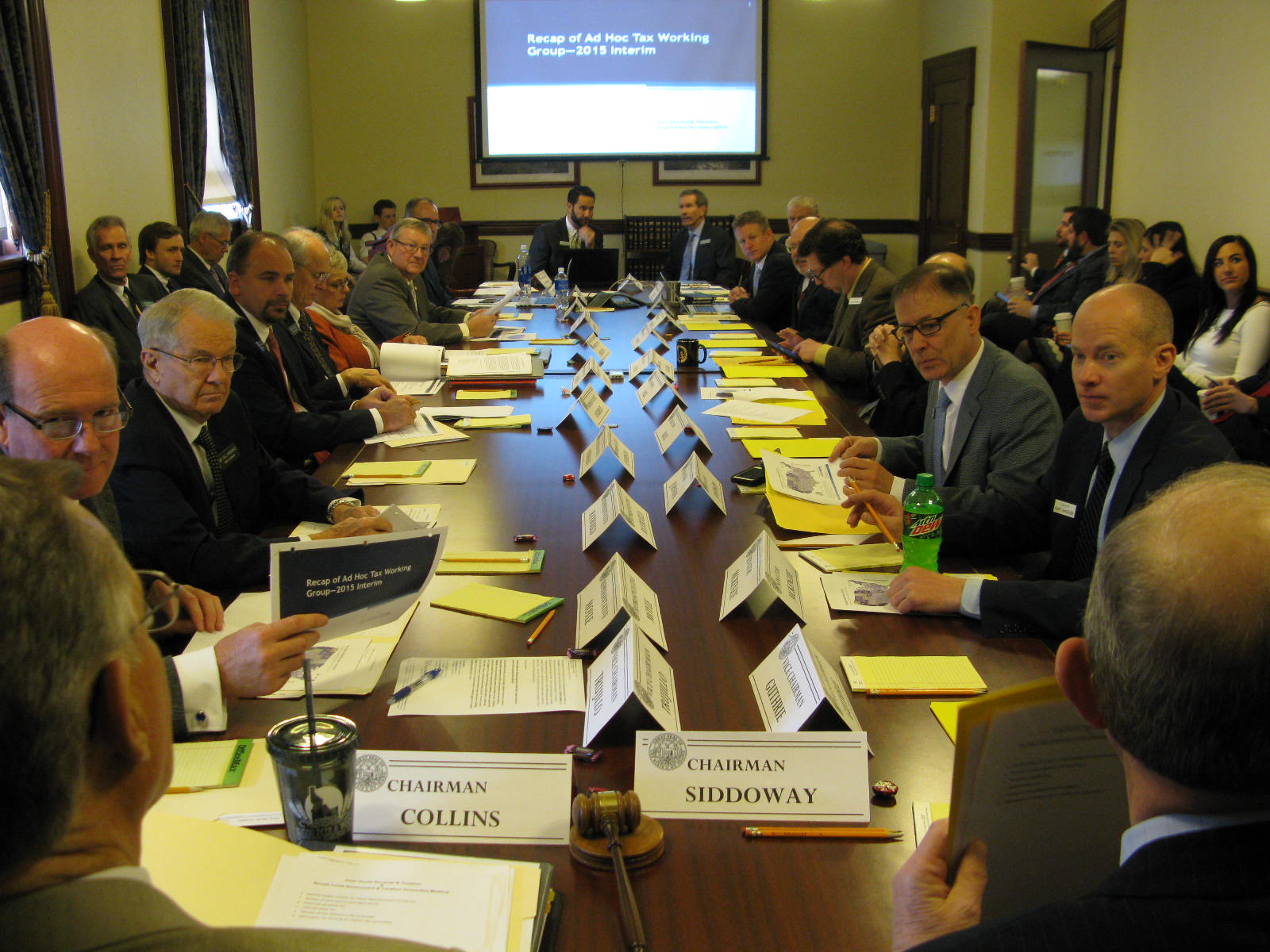 Eric Milstead, director of legislative services, is giving an overview of the working group’s meetings. “The initial meetings were a select group, and then it grew from there,” he said. It started with the two tax chairs, the House speaker and president pro-tem, and legislative staffers making a trip to Utah to meet with Utah lawmakers about that state’s experience with tax reform. “They had an interesting model to examine,” Milstead said. It included an interim committee that held many open, well-publicized meetings around the state.
