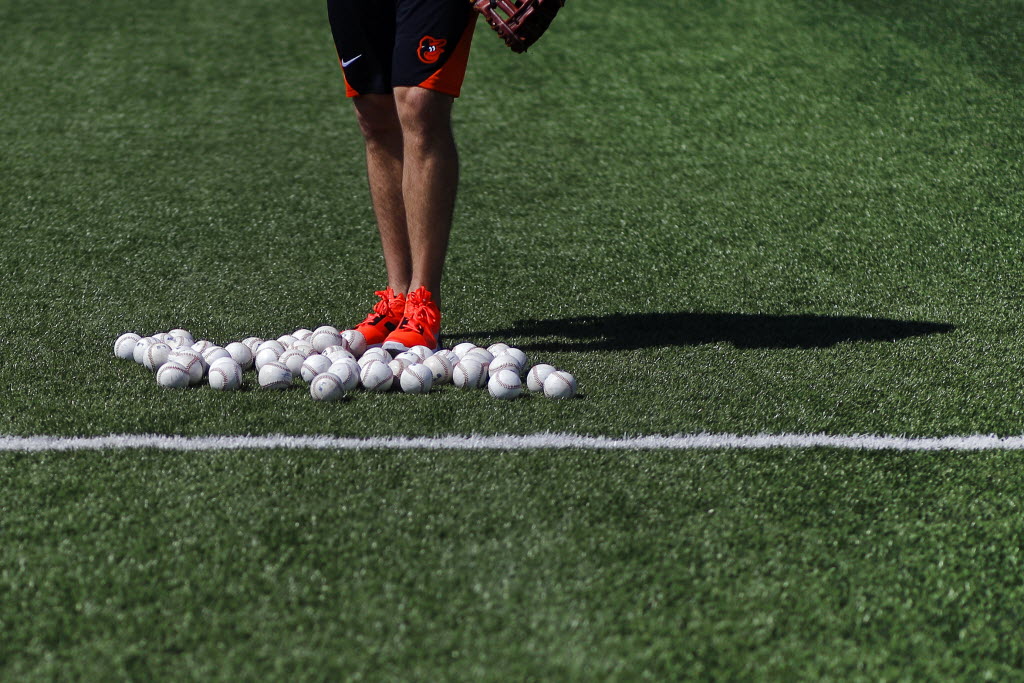 Baltimore Orioles first baseman Chris Davis stands near a pile of baseballs during a spring training baseball workout in Sarasota, Fla., Tuesday. (AP Photo/Patrick Semansky)