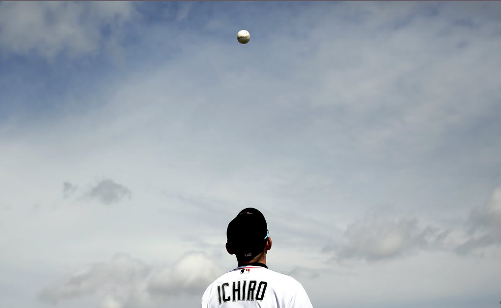 Miami Marlins’ Ichiro Suzuki keeps his eye on a ball after tossing it in the air during spring training baseball practice today in Jupiter, Fla. (AP Photo/Jeff Roberson)