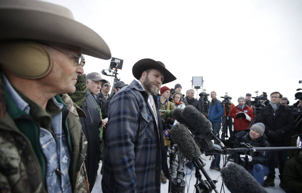 Ammon Bundy, center, one of the sons of Nevada rancher Cliven Bundy, speaks with reporters during a news conference at Malheur National Wildlife Refuge headquarters Monday, near Burns, Ore. Bundy, who was involved in a 2014 standoff with the government over grazing rights, told reporters on Monday that two local ranchers who face long prison sentences for setting fire to land have been treated unfairly. You write the cutline. (AP Photo/Rick Bowmer)