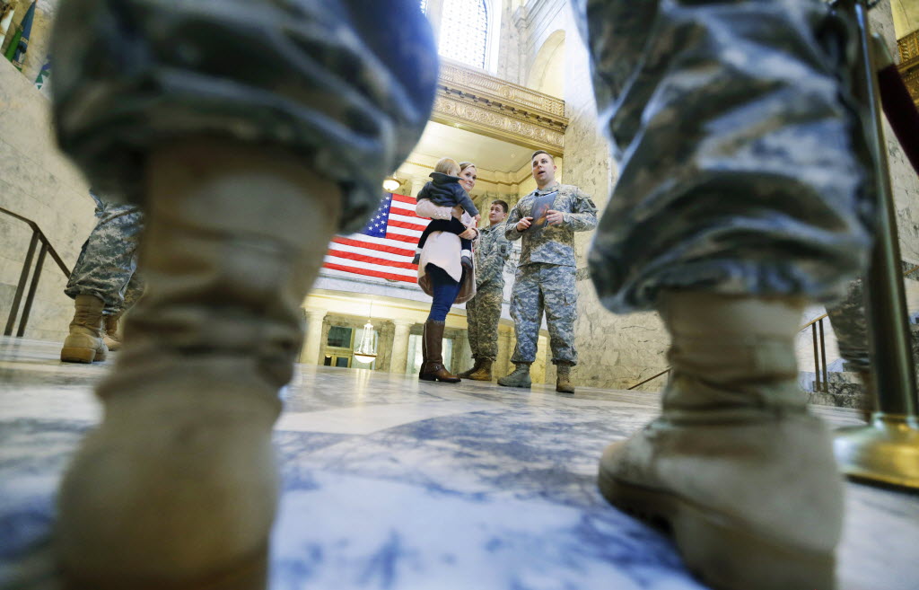 U.S. Army Spc. Scott Drapeau, center right, stands with his wife Kristina and their daughter Adelaide, 18 months, following his re-enlistment ceremony, Thursday at the Capitol in Olympia, Wash. Drapeau, who is an Army medic with the 5th Battalion, 5th Air Defense Artillery Regiment based at Joint Base Lewis McChord, said he chose to have the ceremony for his second re-enlistment at the Capitol because although he is from California, he considers Washington his adopted state and he plans to stay in the area whenever his military career is over. (AP Photo/Ted S. Warren)