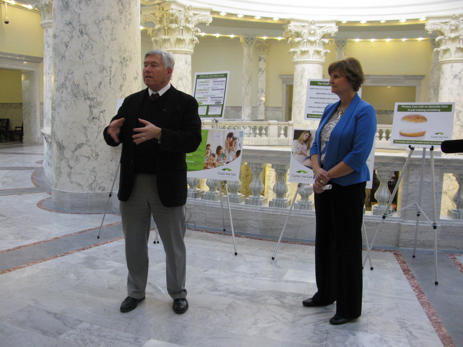 A coalition of 120 organizations called “Close the Gap Idaho” held a press conference in the 4 th floor rotunda of the Capitol this afternoon to say Gov. Butch Otter’s $30 million health care plan won’t close Idaho’s health coverage gap. “This can’t be the total solution,” said Dr. Ted Epperly, CEO of the Family Medicine Residency of Idaho. “I applaud the governor for his initial efforts to help the gap population, but we must still close our health coverage gap through implementing the Healthy Idaho Plan.” That’s the Medicaid expansion plan recommended by the governor’s Medicaid redesign task force, which would, in part, use federal expansion funds to purchase private insurance for people in the gap population.