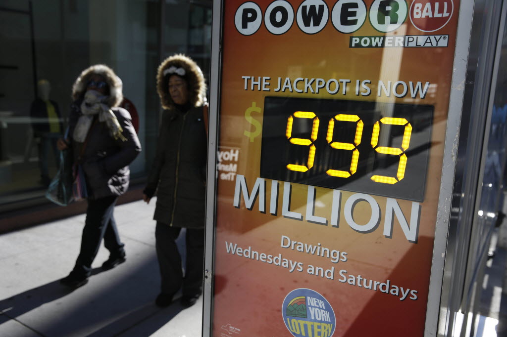 People walk past a sign advertising the Powerball lottery in New York Monday. The jackpot is so big that billboards around the country have to advertise the prize as $999 million because they’re not built to show billions. The Powerfall jackpot has increased to $1.4 billion. Story here. (AP Photo/Seth Wenig)