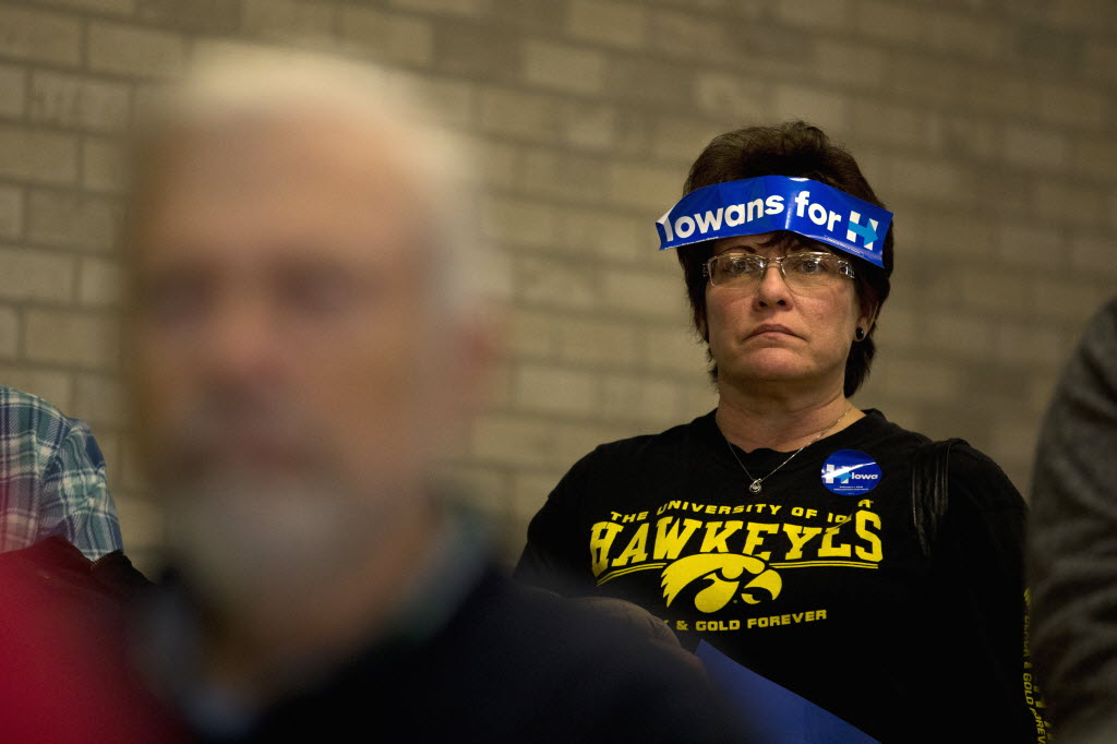 With a campaign sticker on her forehead, Robin Heath listens as Democratic presidential candidate Hillary Clinton speaks at a rally, Monday in Waterloo, Iowa. You write the cutline. (AP Photo/Jae C. Hong)