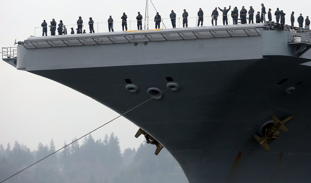 A lone sailor aboard the USS John C. Stennis raises his arms above their head as the crew transitions from manning the rails after departing Naval Base Kitsap Bremerton in Bremerton, Wash., Friday. The aircraft carrier is deploying to the Western Pacific Ocean for about seven months. (Meegan M. Reid/Kitsap Sun via AP)