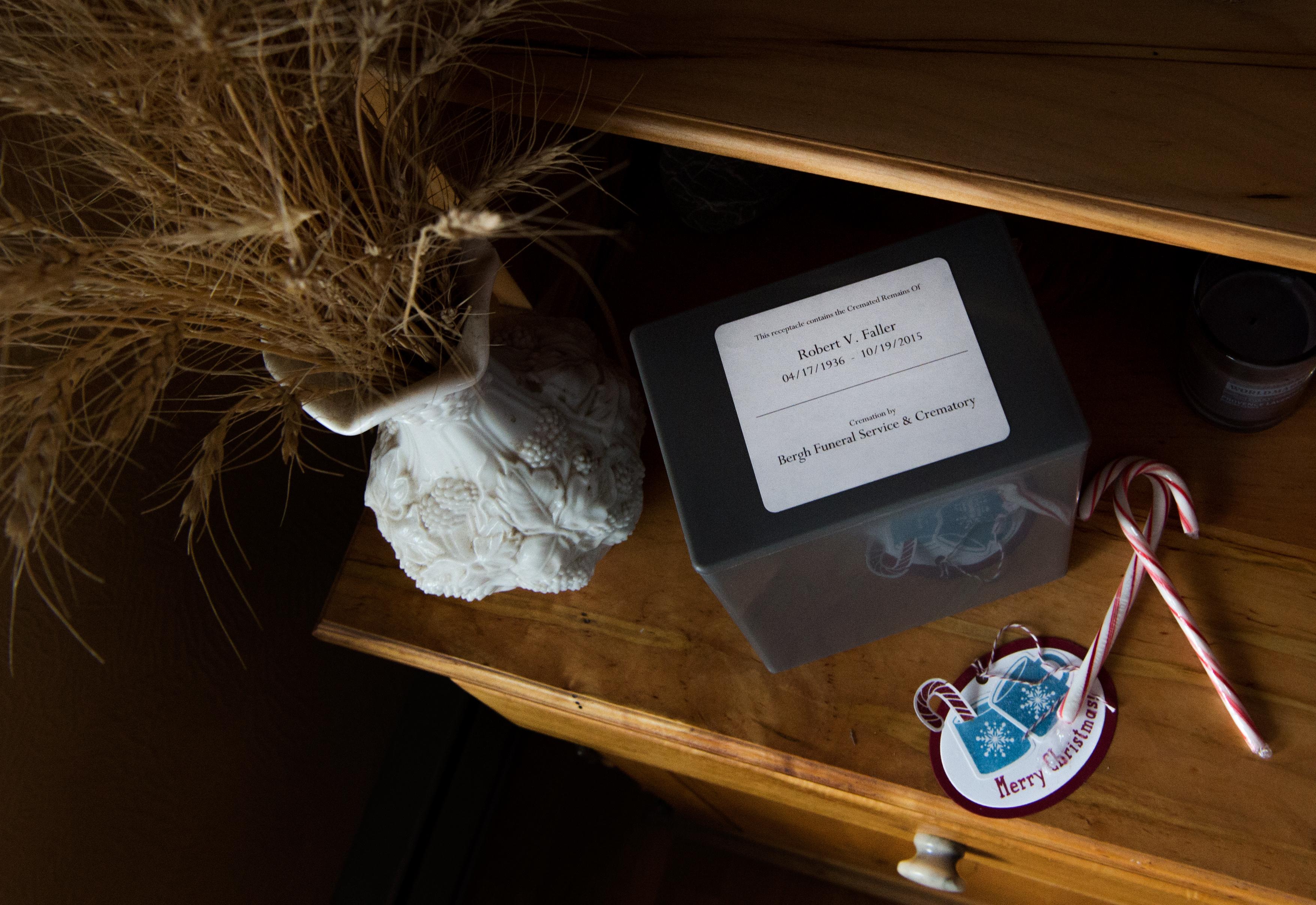 Three months later, Bob’s ashes are in a gray plastic box on a beautiful wooden shelf that he crafted with his own hands years ago. Jane carefully removed the lid, exposing a plastic bag of ash. She put her nose near the bag and took a big sniff. She shrugged. At first she talked to him a lot, lit candles. Not so much now.