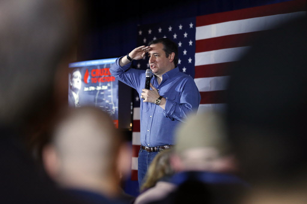 Republican presidential candidate Sen. Ted Cruz, R-Texas, salutes during a campaign stop Wednesday in Hollis, N.H. You write the cutline. (AP Photo/Matt Rourke)