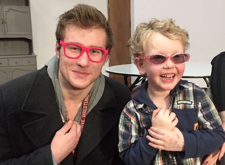 Michael Ferguson, captain of the Cheney High wrestling team and controversial figure as far as the school’s yearbook goes , poses with Ryan Brodwater’s 3-year-old son, Harper, at Bethany Presbyterian Church on Spokane’s South Hill Sunday. Michael, who rocks pink sunglasses, earned headlines for posing for an unusual senior photo in a hot tub. The yearbook counselor and administration rejected the photo. Michael’s fighting that decision. Meanwhile, little Harper rocks the sunglasses look — and Ryan tells Huckleberries that his partner in the photo is a member of his church and a “great kid.” (Courtesy photo: Ryan Brodwater)