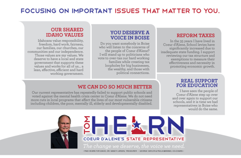 Trustee Tom Hearn of the Coeur d’Alene School District officially announced his candidacy for the House District 4B seat now held by state Rep. Kathy Sims, R-Coeur d’Alene. In his announcement Hearn took issue with several legislative actions taken by Sims, including her opposition to a mental health center that has been built in Coeur d’Alene: