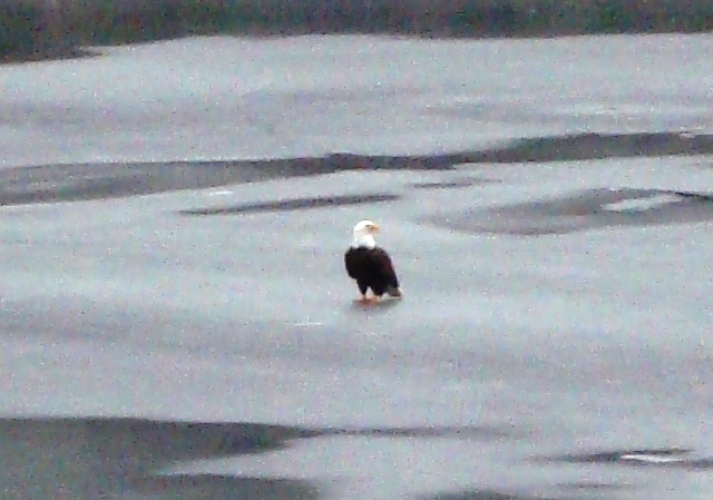 Here’s something that Walkabout rarely sees in the region, despite her many travels on foot all around Coeur d’Alene and beyond — an eagle resting on ice. She photographed this bird on the ice at Fernan Lake Tuesday.