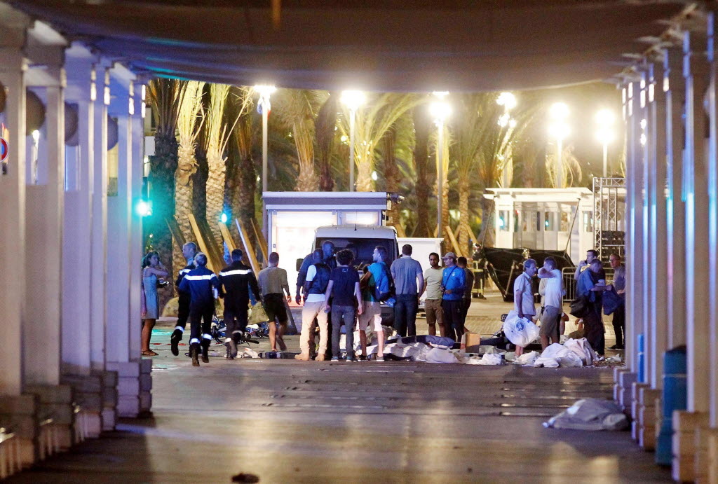 People stand next to covered bodies in the early hours of Friday on the Promenade des Anglais in Nice, southern France. France has been stunned again as a large white truck killed many people after it mowed through a crowd of revelers gathered for a Bastille Day fireworks display late Thursday evening, in the Riviera city of Nice. (AP Photo)