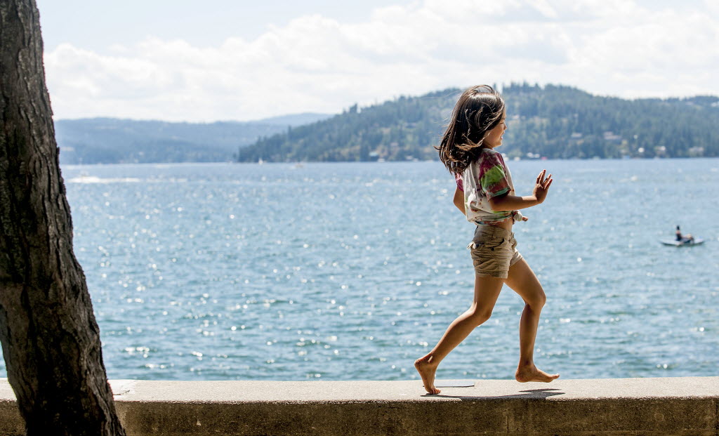 Six-year-old Yuna Kim of Vancouver BC runs along the seawall at City Beach in Coeur d’Alene on Wednesday. She and her family scheduled a stop in Coeur d’Alene on their way to Yellowstone National Park. (Kathy Plonka/SR photo)
