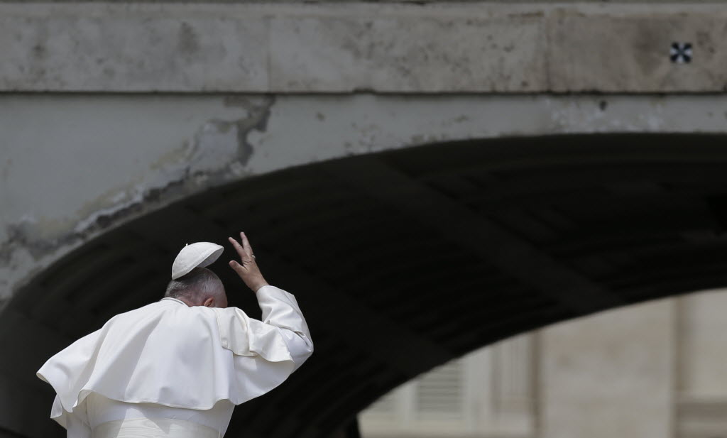 Pope Francis tries to hold on to his skull cap blown away by the wind as leaves after his weekly general audience in St. Peter’s Square at the Vatican Wednesday. You write the cutline. (AP Photo/Alessandra Tarantino)