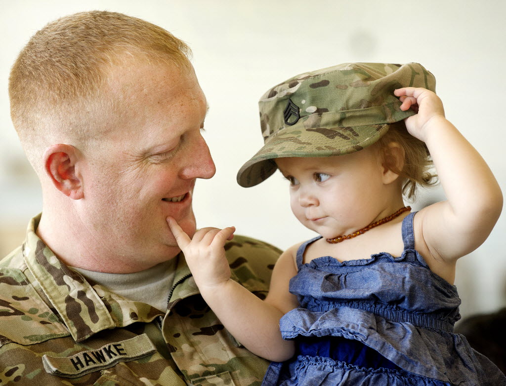 U.S. Army Staff Sgt. Matthew Hawke, of Lincoln, enjoys a moment with his daughter Brooklyn during a sending off ceremony for him and additional members of the Nebraska Army National Guard’s Company G, 2-104th General Support Aviation Battalion, based out of Lincoln, Neb., Friday. While deployed the soldiers will be responsible for conducting aeromedical evacuation support operations. Their mission is expected to last approximately one year. (Francis Gardler/The Journal-Star via AP)