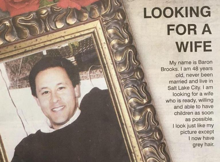 You think your parents meddle in your life? Salt Lake City businessman Baron Brooks said he was shocked to see a full-page advertisement in a North Idaho newspaper Saturday inviting candidates to interview to be his wife. The 48-year-old broker in the health food trade quickly deduced who was behind the $900 Coeur d’Alene Press ad , which listed criteria such as age, height and political views – “If you voted for Obama or plan to vote for Hillary you are not for me.” “My father did this without my consent,” Brooks said in a phone interview Monday. “I can’t even describe to you how embarrassing and ridiculous this is.”