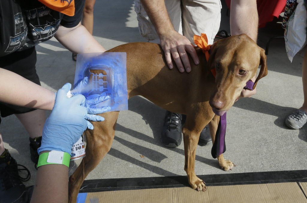 Ariel, a Vizsla, looks back as an Old English “D” is sprayed on during the Bark in the Park promotion before a baseball game between the Detroit Tigers and the Seattle Mariners Tuesday in Detroit. You write the cutline. (AP Photo/Carlos Osorio)