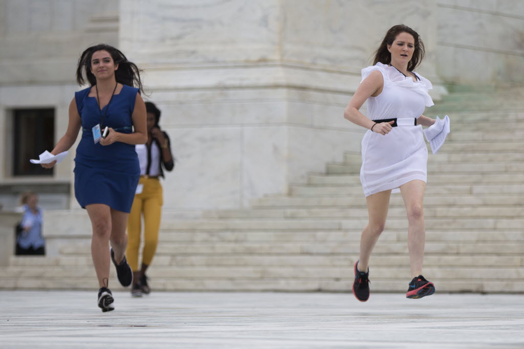 Members of the media run from the Supreme Court in Washington Thursday, as they deliver decisions to colleagues waiting outside the court. You write the cutline. (AP Photo/Evan Vucci)