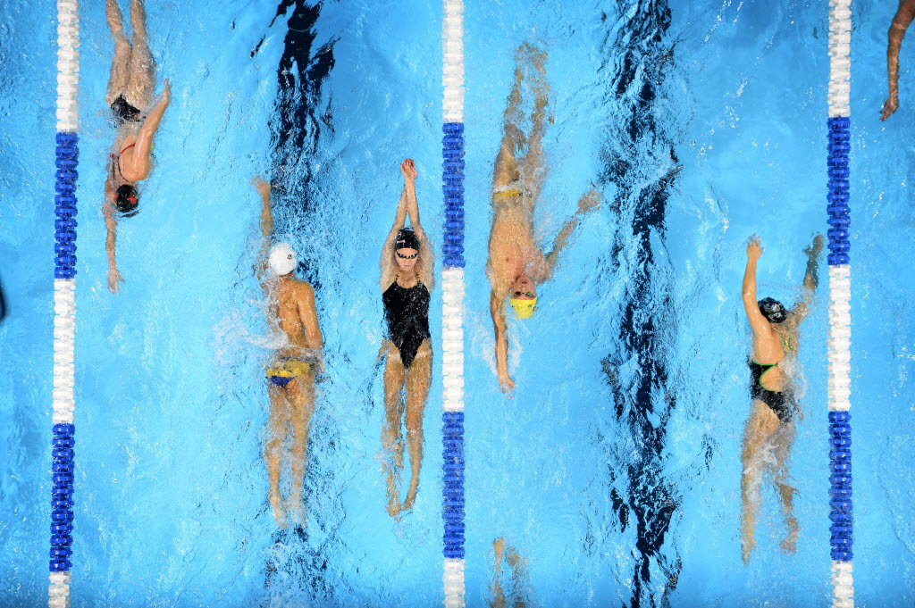 Swimmers warm up prior to preliminaries at the U.S. Olympic swimming trials, Monday, in Omaha, Neb. (AP Photo/Mark J. Terrill)