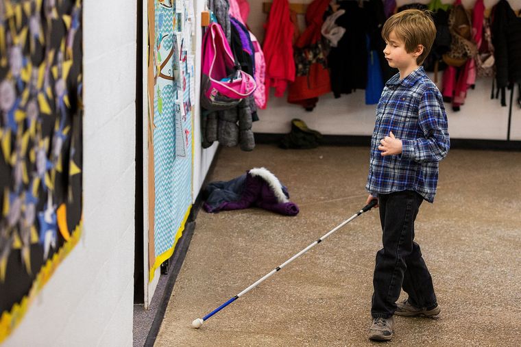 Alex Owens, a second-grade student at Ponderosa Elementary, who is blind, uses his cane to navigate through the halls of the school on the way to math class. Alex will soon be able to navigate around Ponderosa Elementary better thanks to the helping hands of his classmates. Story here . (Shawn Gust/Press photo)
