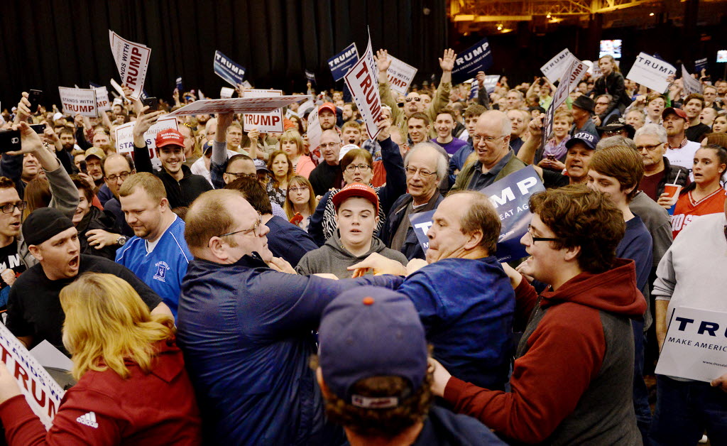 A protester, center left, and a Trump supporter, center right, scuffle during a rally for Republican presidential candidate Donald Trump Saturday, held at the I-X Arena in Cleveland, Ohio. You write the cutline. (Michael Henninger/Pittsburgh Post-Gazette via AP)