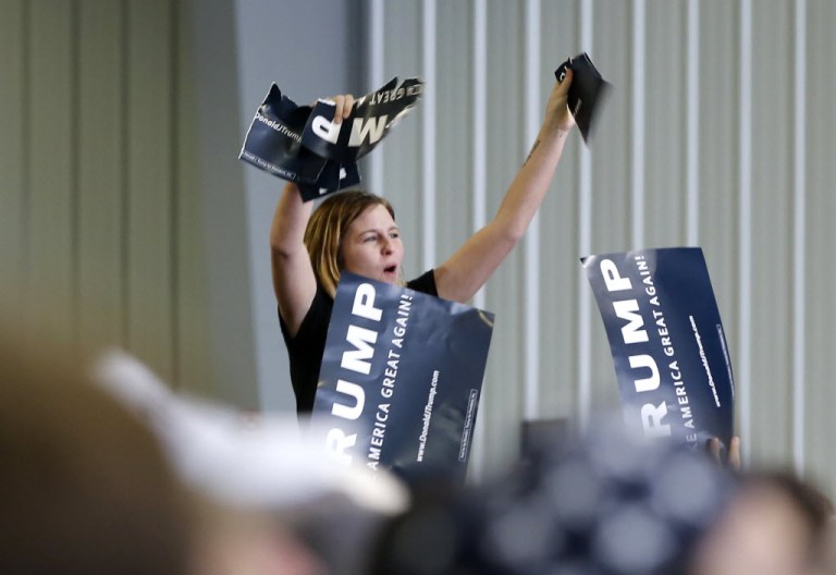 A protester tears up a campaign sign for Republican presidential candidate Donald Trump during a rally Sunday in Bloomington, Ill. (AP Photo/Charles Rex Arbogast)